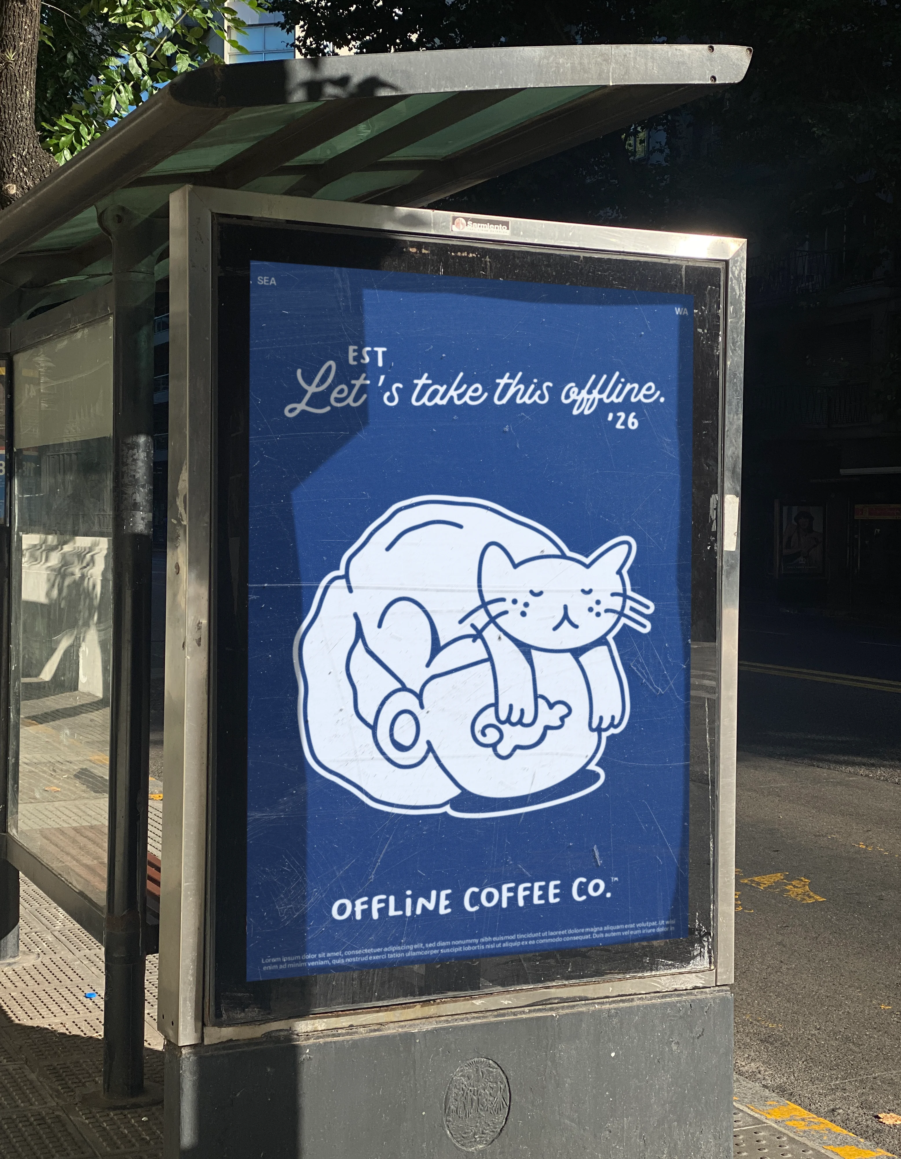 Offline Coffee is an up-and-coming café brand built around the idea of slowing down and reconnecting - using coffee as a way to step away from constant digital noise. This project started as a personal exploration. I wanted to take a brand I genuinely admire and see how far its existing identity could be extended while staying true to its original spirit. Rather than redesigning everything from scratch, I approached this as a brand extension, focusing on flexibility, consistency, and real-world usability. Since they already had a main logo and a small mascot concept, I thought having few more variations can be a way to go, and yes! I developed the mascot to fit more into the branding across all the touch points.